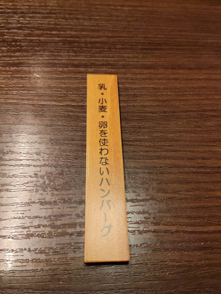 「乳・小麦・卵を使わないハンバーグ」と記載された木製札と、ドレッシングが添えられていました。