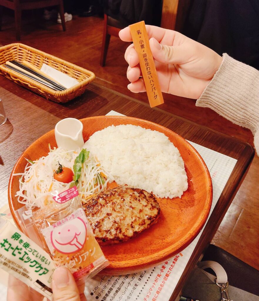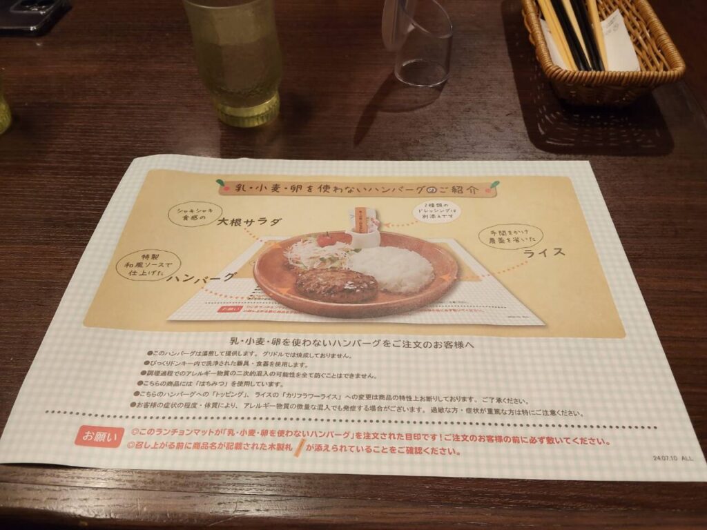 乳・小麦・卵を使わないハンバーグを注文すると、店員さんが事前にランチョマットを「乳・小麦・卵を使わないハンバーグ」を注文した娘の前にひいてくれました。